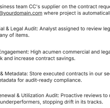 We handle the heavy lifting so your teams can focus on business impact. undrift's point of integration is a shared centralized contracts inbox for full transparency between suppliers, business, and finance.
