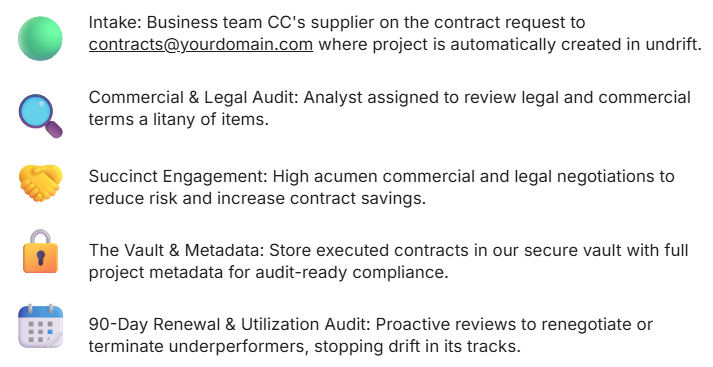 undrift is an elite managed procurement platform that oversees your company's non-strategic spend—from indirect OpEx like software to critical CapEx infrastructure like hardware. undrift procurement analysts negotiate favorable commercial and legal terms, automate supplier follow-ups, and prevent renewal drift and arbitrary increases. Every dollar is intentional, every contract optimized without impacting growth velocity.